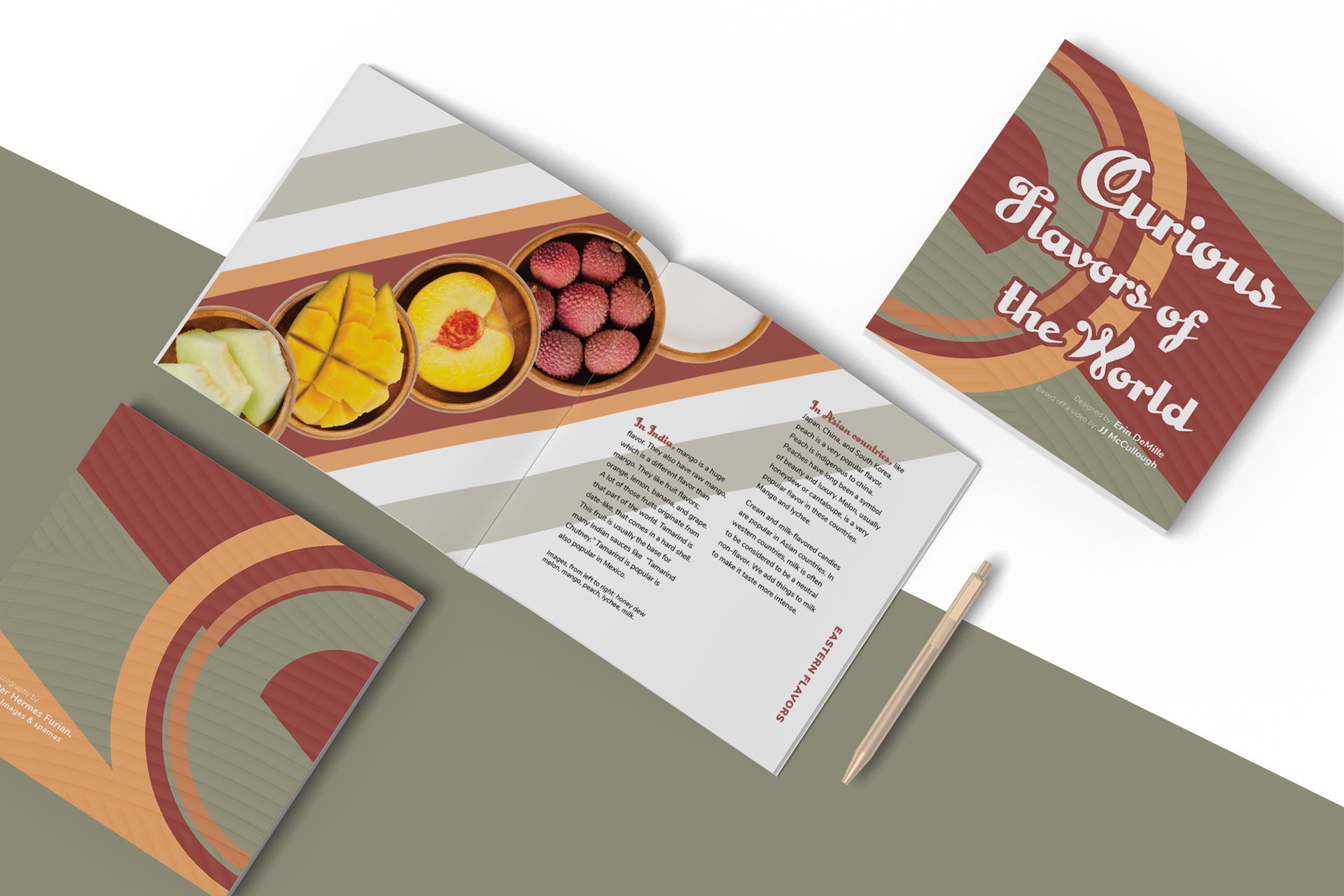 This 6-inch by 6-inch book that talks about popular candy flavors found around the world. Based on a video by J.J. McCullough. Using photography to show what flavors are being talked about visually. The color scheme has a more natural tone, that helps compliment the imagery. It uses basic shapes arranged to create simple yet beautiful compositions.